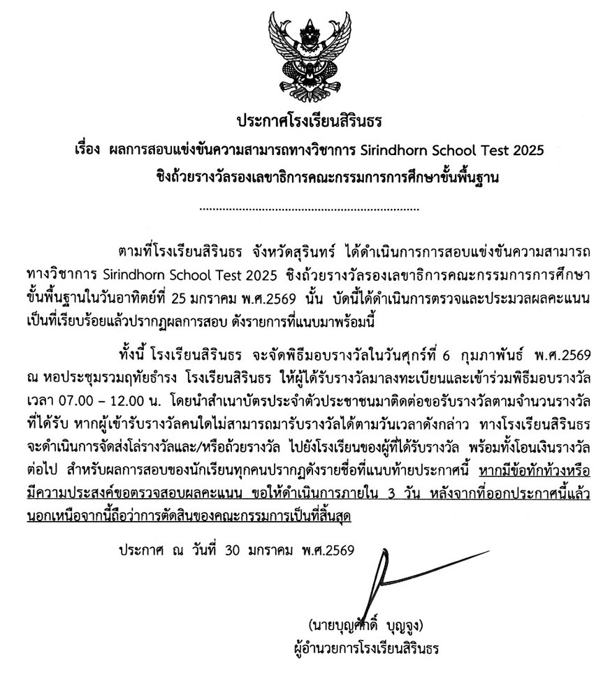โรงเรียนสิรินธร จังหวัดสุรินทร์ กำหนดจัดกิจกรรมในโครงการสอบแข่งขันความสามารถทางวิชาการ จำนวน 4 วิชา ได้แก่ วิชาคณิตศาสตร์ วิทยาศาสตร์ ภาษาอังกฤษ และสังคมศึกษา สำหรับนักเรียนระดับชั้นประถมศึกษาปีที่ 4-6 และระดับชั้นมัธยมศึกษาปีที่ 1-5 ในรายการ “Sirindhorn School Test 2025 ชิงถ้วยรางวัลรองเลขาธิการคณะกรรมการการศึกษาขั้นพื้นฐาน” โดยจัดสอบแข่งขันในวันอาทิตย์ที่ 25 มกราคม พ.ศ. 2569 ณ โรงเรียนสิรินธร จังหวัดสุรินทร์ เพื่อพัฒนาศักยภาพนักเรียน ส่งเสริมและสนับสนุนให้นักเรียนได้แสดงออกซึ่งความรู้ ความสามารถด้านวิชาการ ตลอดจนเปิดโอกาสให้นักเรียนมีเวทีทดสอบความสามารถด้านวิชาการ