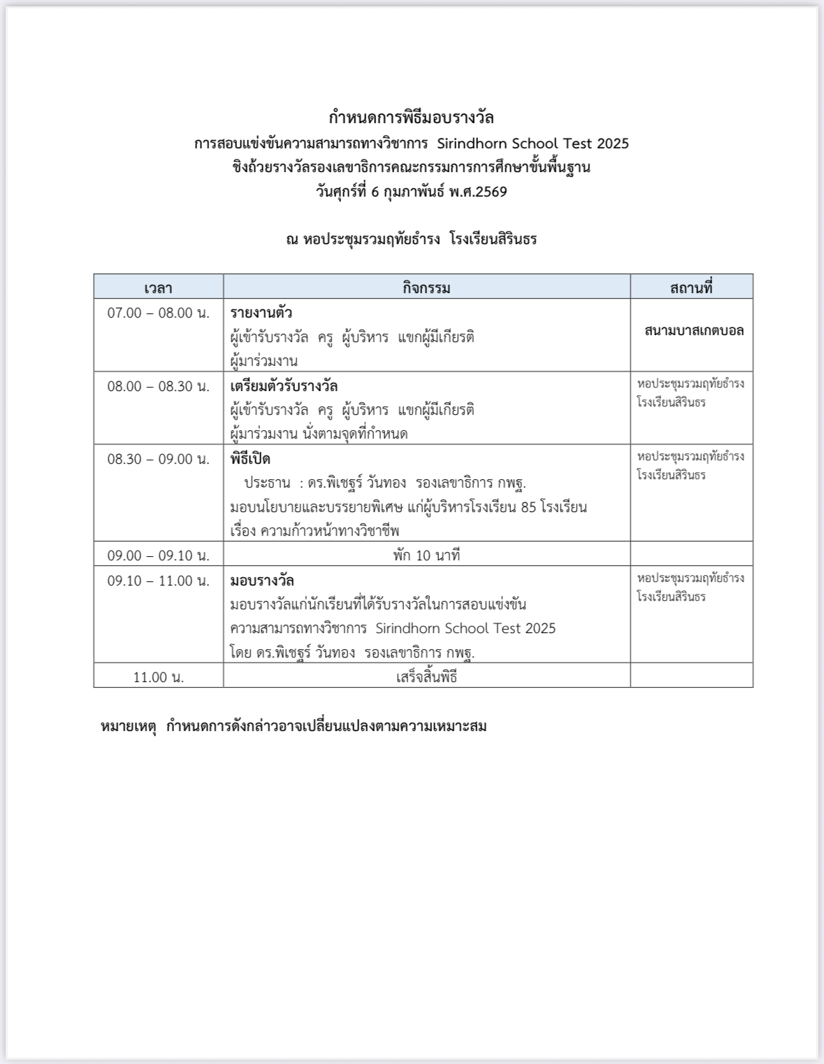 โรงเรียนสิรินธร จังหวัดสุรินทร์ กำหนดจัดกิจกรรมในโครงการสอบแข่งขันความสามารถทางวิชาการ จำนวน 4 วิชา ได้แก่ วิชาคณิตศาสตร์ วิทยาศาสตร์ ภาษาอังกฤษ และสังคมศึกษา สำหรับนักเรียนระดับชั้นประถมศึกษาปีที่ 4-6 และระดับชั้นมัธยมศึกษาปีที่ 1-5 ในรายการ “Sirindhorn School Test 2025 ชิงถ้วยรางวัลรองเลขาธิการคณะกรรมการการศึกษาขั้นพื้นฐาน” โดยจัดสอบแข่งขันในวันอาทิตย์ที่ 25 มกราคม พ.ศ. 2569 ณ โรงเรียนสิรินธร จังหวัดสุรินทร์ เพื่อพัฒนาศักยภาพนักเรียน ส่งเสริมและสนับสนุนให้นักเรียนได้แสดงออกซึ่งความรู้ ความสามารถด้านวิชาการ ตลอดจนเปิดโอกาสให้นักเรียนมีเวทีทดสอบความสามารถด้านวิชาการ